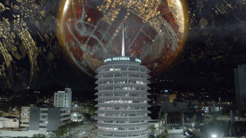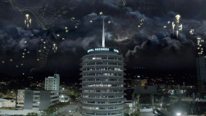 Drone-captured augmented reality images of the Capitol Records Tower shot during Avenged Sevenfold’s live-streamed performance.