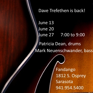 Bill Buchman’s Art of Jazz Trio: Every Saturday evening, 7-9 PM, Burns Court Cafe, 401 S. Pineapple Ave. Tel. 941 312 6633. Come enjoy the good music, food and atmosphere withBill on piano, Michael Ross on bass and Chuck Parr on drums.