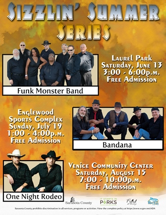 SARASOTA COUNTY- Sarasota County Parks, Recreation and Natural Resources will host the Second Annual Sizzlin’ Summer Concert Series starting on June 13 at Laurel Park, 509 Collins Road in Laurel (Nokomis). This free, outdoor concert will feature funk-tastic favorites performed by the Funk Monster Band from 3-6 p.m. Bring a blanket or lawn chair and kick back to some great tunes.